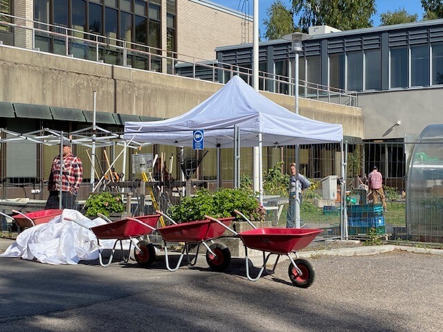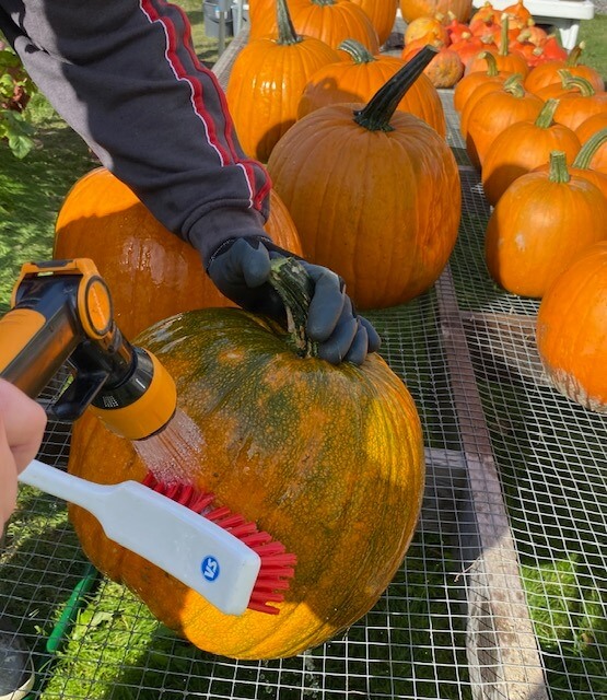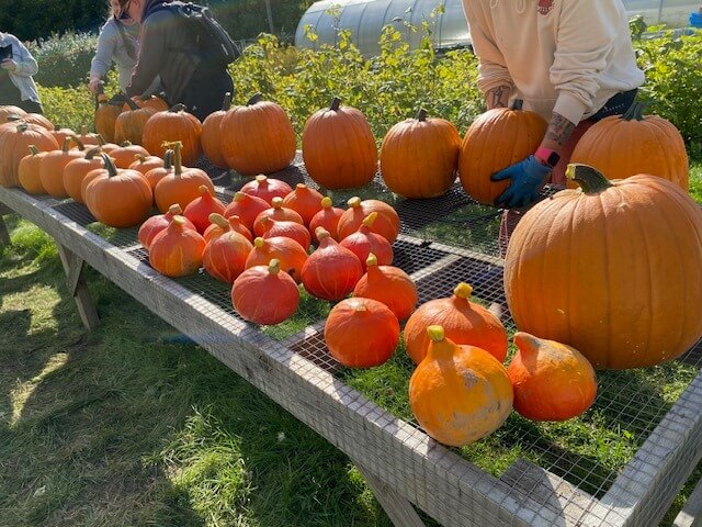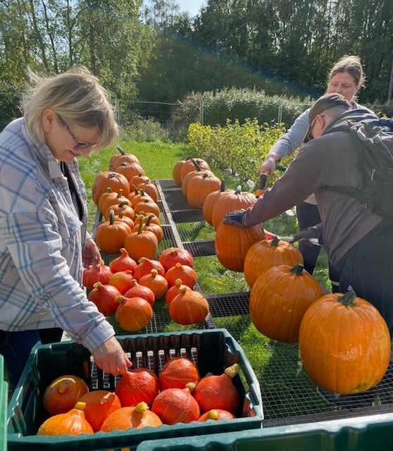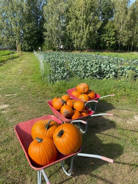 Iltapäivän ryhmä pääsi aloittamaan kurpitsojen valtavan sadon keräysurakkaa parin sadan kilon saaliilla. Aarteet kärrättiin pesupaikalle, aseteltiin ritilän päälle ja puhdistettiin harjalla ja vedellä. Kottikärrätessä tärkeää on olla irroitamatta toista kättä kesken matkan! 🙂