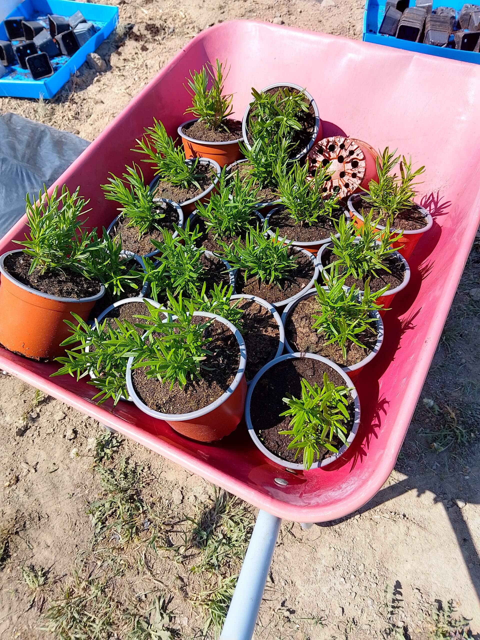 Helteinen kesäpäivä jo toukokuussa. Toinen ryhmä istutti rosmariinia rutikuivaan maahan ja toinen ryhmä kylvi rivivälinurmea eri puolille peltoa. Maa on nyt niin kuivaa, että peltoa tarvitsee kastella sadettimella. Aamulla satoi hiukan vettä, 1 mm, mutta se ei riitä näillä helteillä. Aurinkoisella taimipöydällä lämpömittari näytti 39 °C. Toivotaan, että pian sataa!