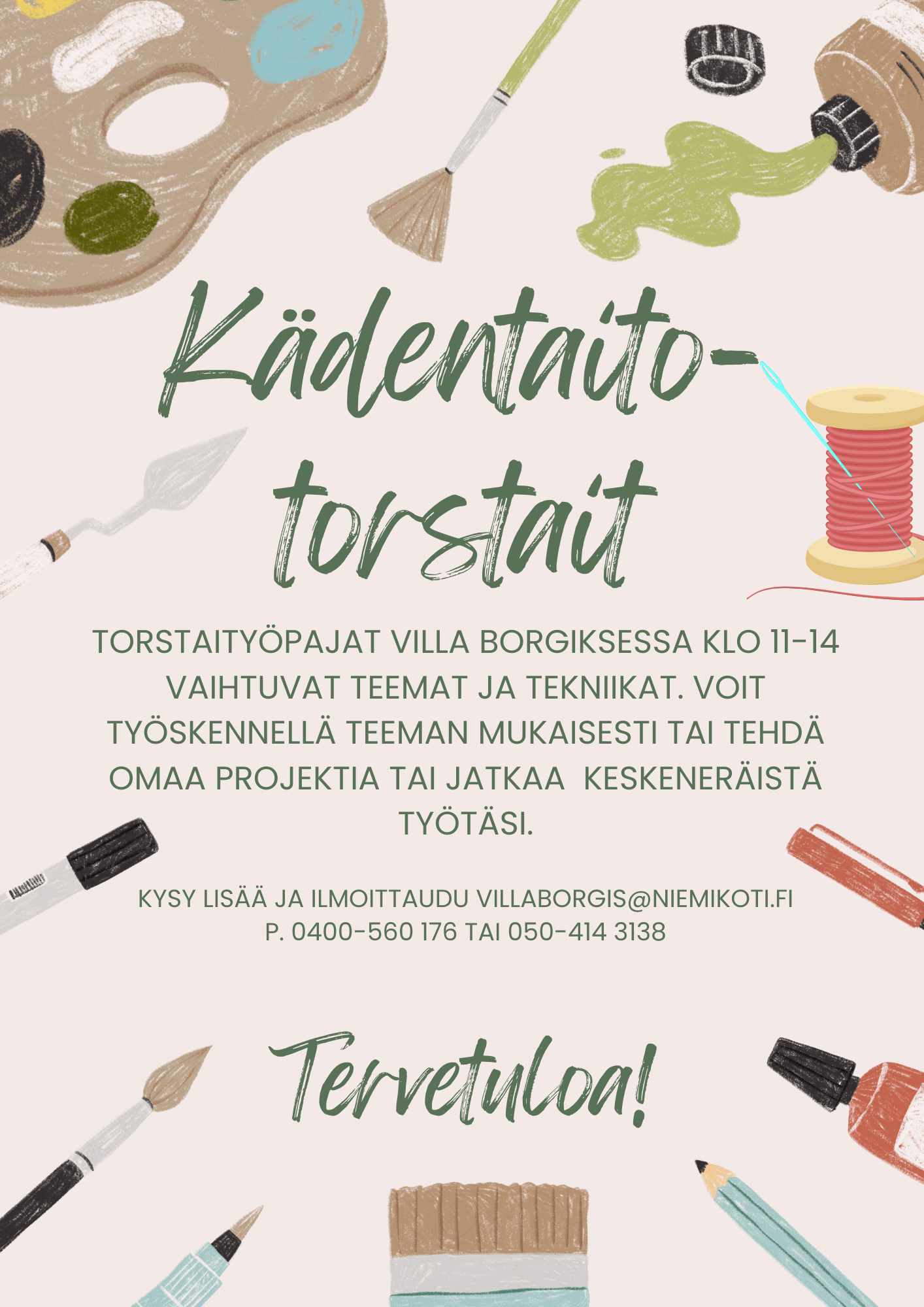Torstaityöpajoissa vaihtuvat teemat ja tekniikat. Voit työskennellä teeman mukaisesti tai tehdä omaa projektia tai jatkaa keskeneräistä työtäsi. Kysy lisää ja ilmoittaudu villaborgis@niemikoti.fi tai puh. 0400 560 176 tai 050 414 3138.