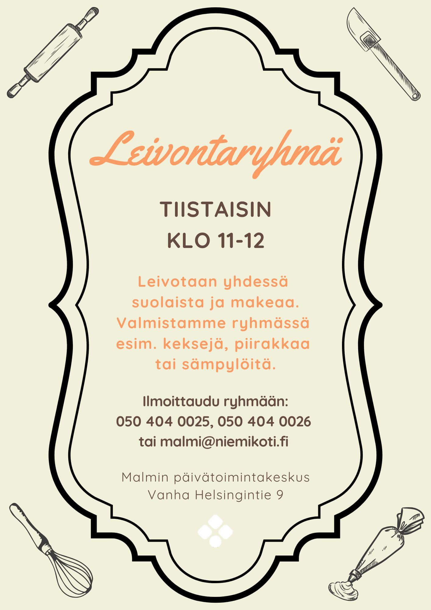 Leivotaan yhdessä suolaista ja makeaa. Valmistamme esimerkiksi keksejä, piirakkaa tai sämpylöitä. Ilmoittaudu ryhmään puhelimitse 050 404 0025 tai 050 404 0026 tai sähköpostitse malmi@niemikoti.fi.
