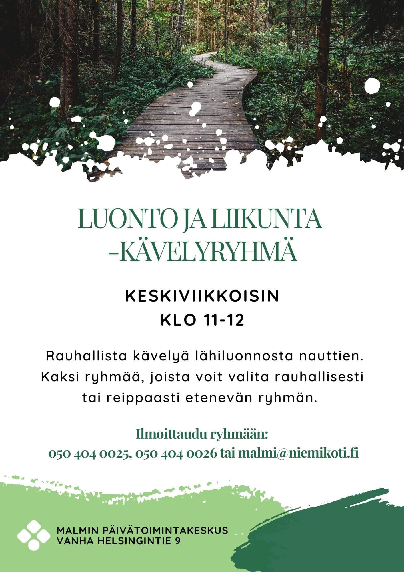 Rauhallista kävelyä lähiluonnosta nauttien. Kaksi ryhmää, joista voit valita rauhallisesti tai reippaasti etenevän ryhmän. Ilmoittaudu mukaan puhelimitse 050 404 0025 tai 050 404 0026 tai sähköpostilla malmi@niemikoti.fi.