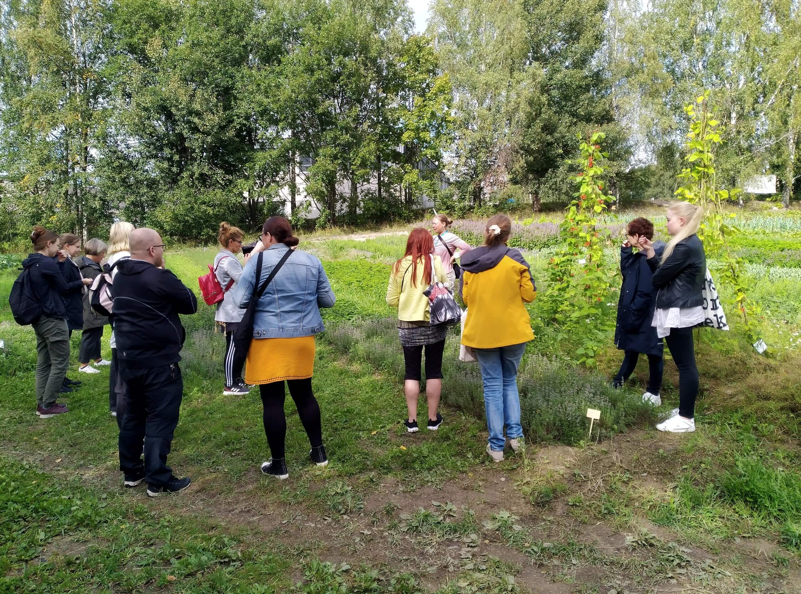 Tuoksuttelimme ja maistelimme monia yrttejä, muun muassa talvikynteliä, sitruunamelissaa, salviaa, viherminttua ja anista. Ihailimme pellon satoa ja saimme paljon tietoa erilaisten yrttien, vihannesten ja juuresten luomu- ja biodynaamisesta viljelystä.