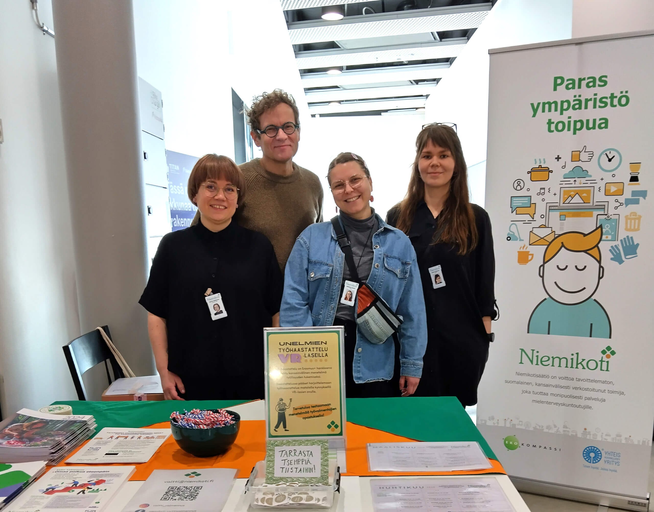 Kuvassa Valtti Valmennuksen porukka Kaikki töihin 2025 -tapahtumassa: vasemmalta Emma Heikkinen, Pasi Tuominiemi, Matleena Huovio ja Saana Koskimaa.