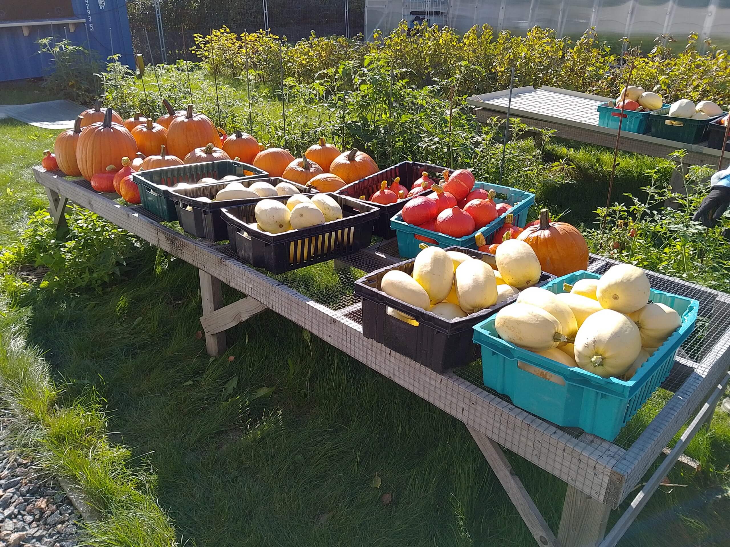 Pellolla jatkoimme sadonkorjuuta. Keräsimme spagettikurpitsaa, hokkaidokurpitsaa ja jättikurpitsaa. Opimme, että spagettikurpitsa on kypsä, kun se on kauttaaltaan keltainen eikä enää viherrä. Hokkaidokurpitsan tulee olla tumma tiilenpunainen ja jättikurpitsan tasaisen oranssi. Kurpitsat oli tärkeää kerätä talteen, koska yöksi on luvattu hallaa. Työ sujui ryhmältä sutjakkaasti ja keräsimme monta kottikärryllistä kurpitsaa. Lopuksi pesimme kurpitsat ja jätimme ne kuivumaan aurinkoon.