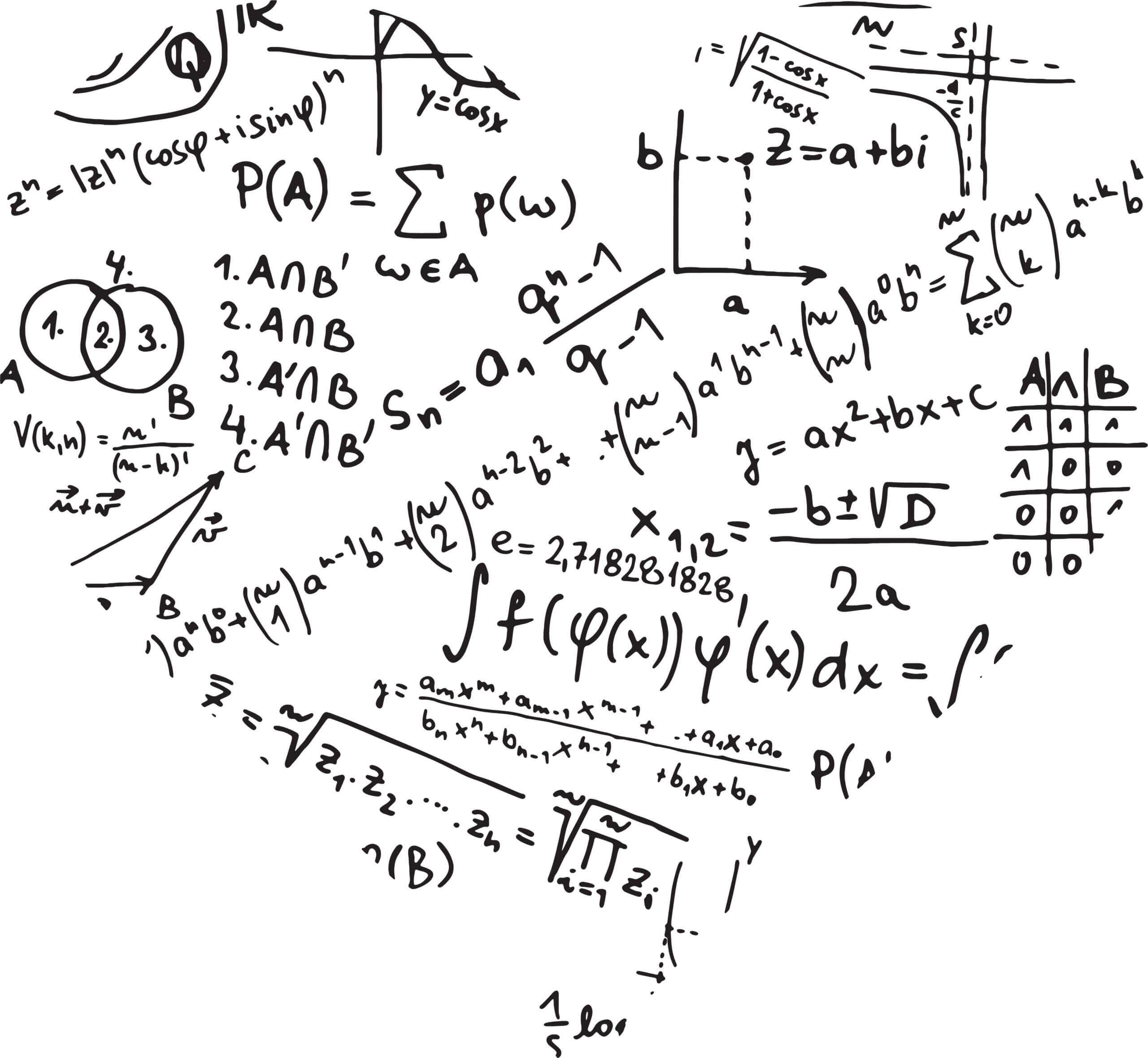 Sydänmuotoon piirrettyjä matemaattisia kaavoja ja symboleja.