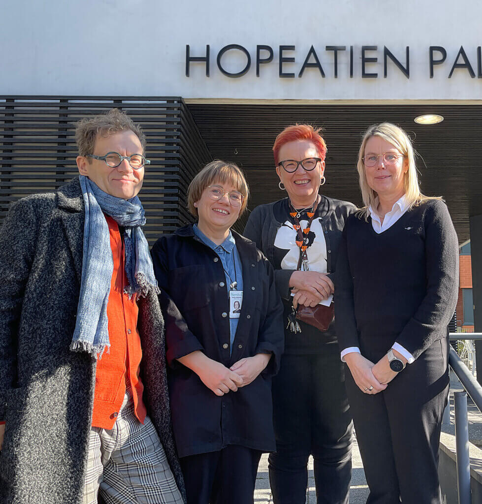 Vasemmalta: Niemikotisäätiön Valtti Valmennuksen työvalmenta Pasi Tuominiemi ja vastaava ohjaaja Emma Heikkinen, Seniorisäätiön palvelutoiminnan johtaja Maria Laaksonen ja toimitusjohtaja Marika Metsähonkala.