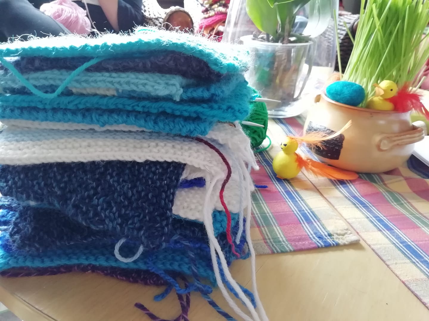 Pääsiäistipu ihmettelee mikä tuo valtava neulekasa on. Torstaisin kädentaitoja ja tekstiilitaidetta ? Poikkeuksena ensi viikolla kiirastorstai, jolloin lähdemme brunssin jälkeen retkelle Talvipuitarhaan.