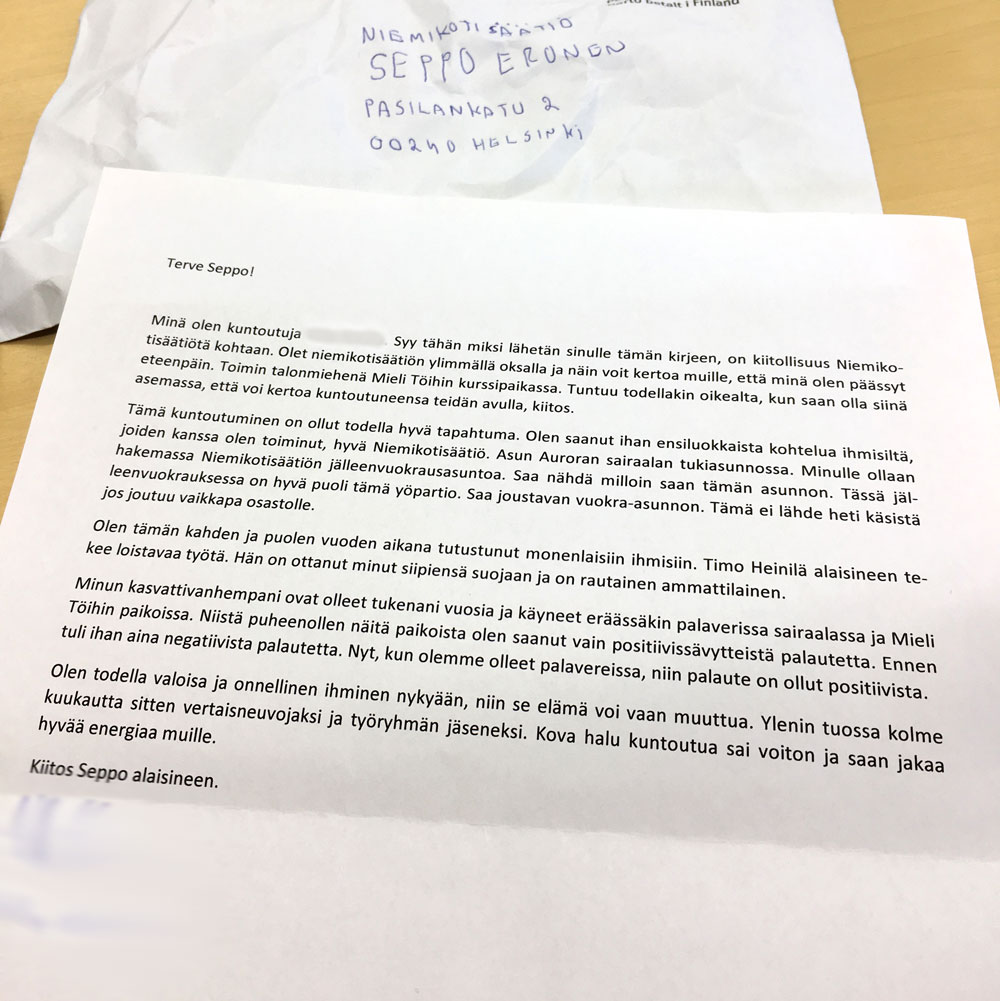 Niemikotisäätiön toiminnanjohtaja Seppo Eronen sai taannoin ilahduttavaa postia. Palvelunkäyttäjä Niemikotisäätiön Mieli Töihin® -yksiköstä halusi antaa palautetta kokemuksistaan säätiön palveluissa. Kirje oli kokonaisuudessaan kiittävä ja muistutti sisällöllään taas siitä, kuinka positiivinen palaute auttaa ihmistä parhaiten eteenpäin.