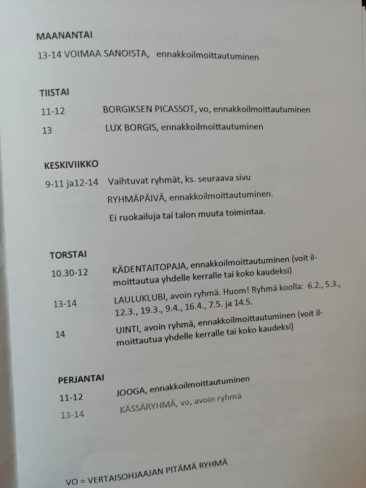 Villa Borgiksen kevään 2020 ohjelma on saatu kirjoihin ja kansiin, ryhmät starttaavat toden teolla ensi viikolla. Toistaiseksi voit pyytää koko ohjelman ja ryhmien sisällöt sähköpostilla villaborgis@nie